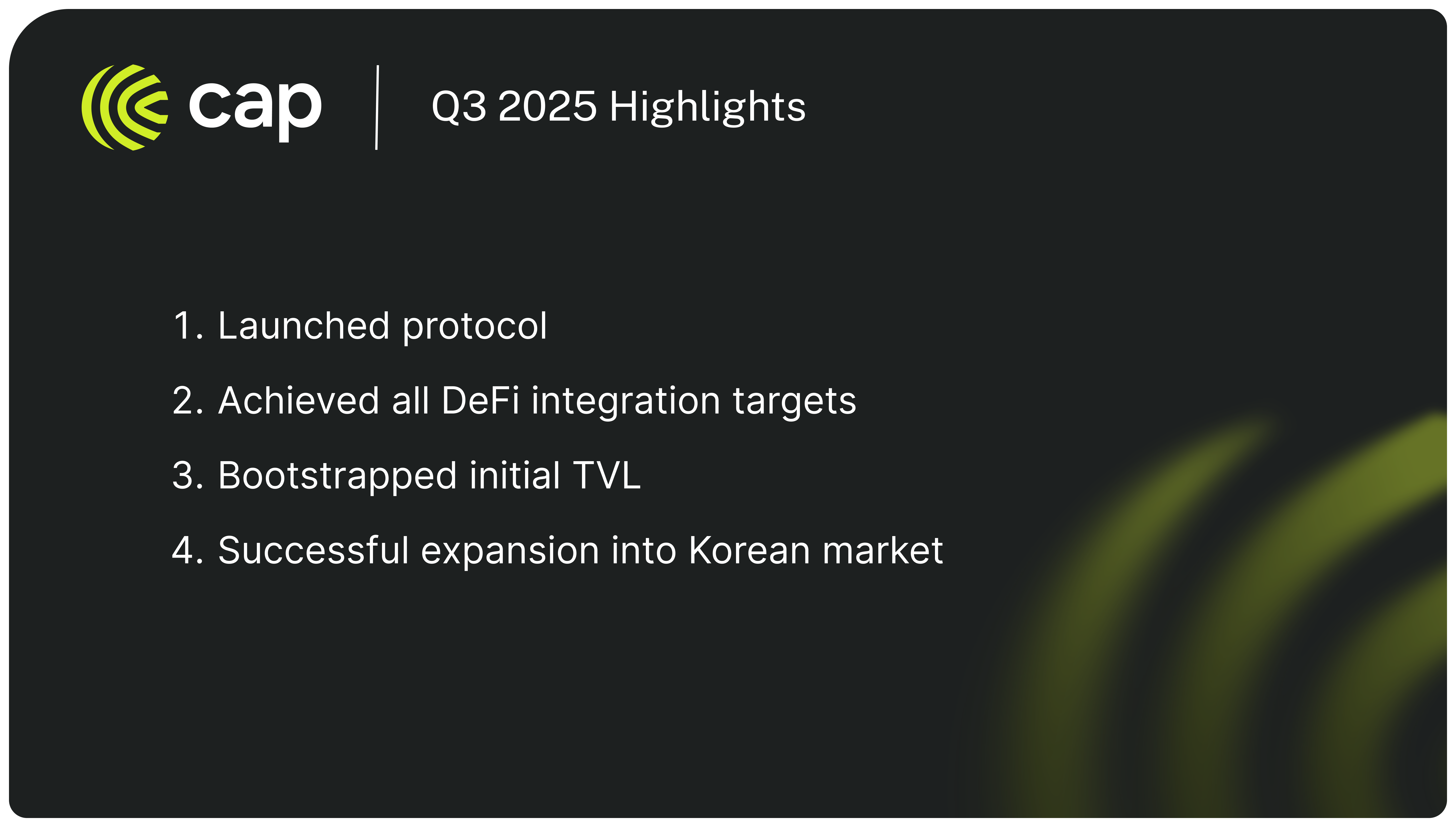Now that Cap is live, all future quarterly investor update will be made public. In this update, you will find highlights on our progress, upcoming priorities, and asks.